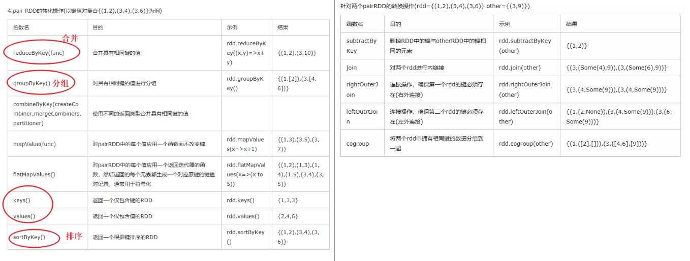 | rdd.zip(rdd1) | 组合两个zip, 将两个RDD的元素对应的匹配在一起,要求两个RDD的元素个数相同,且两个RDD的分区数也相同,结果会生成一个PairRDD |