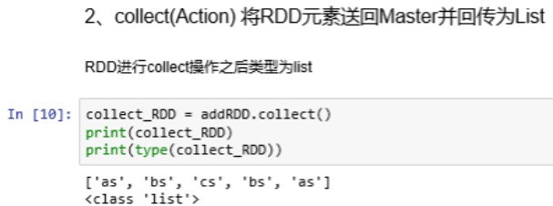 | collect | 将RDD元素送回Master并返回List类型 | Action |